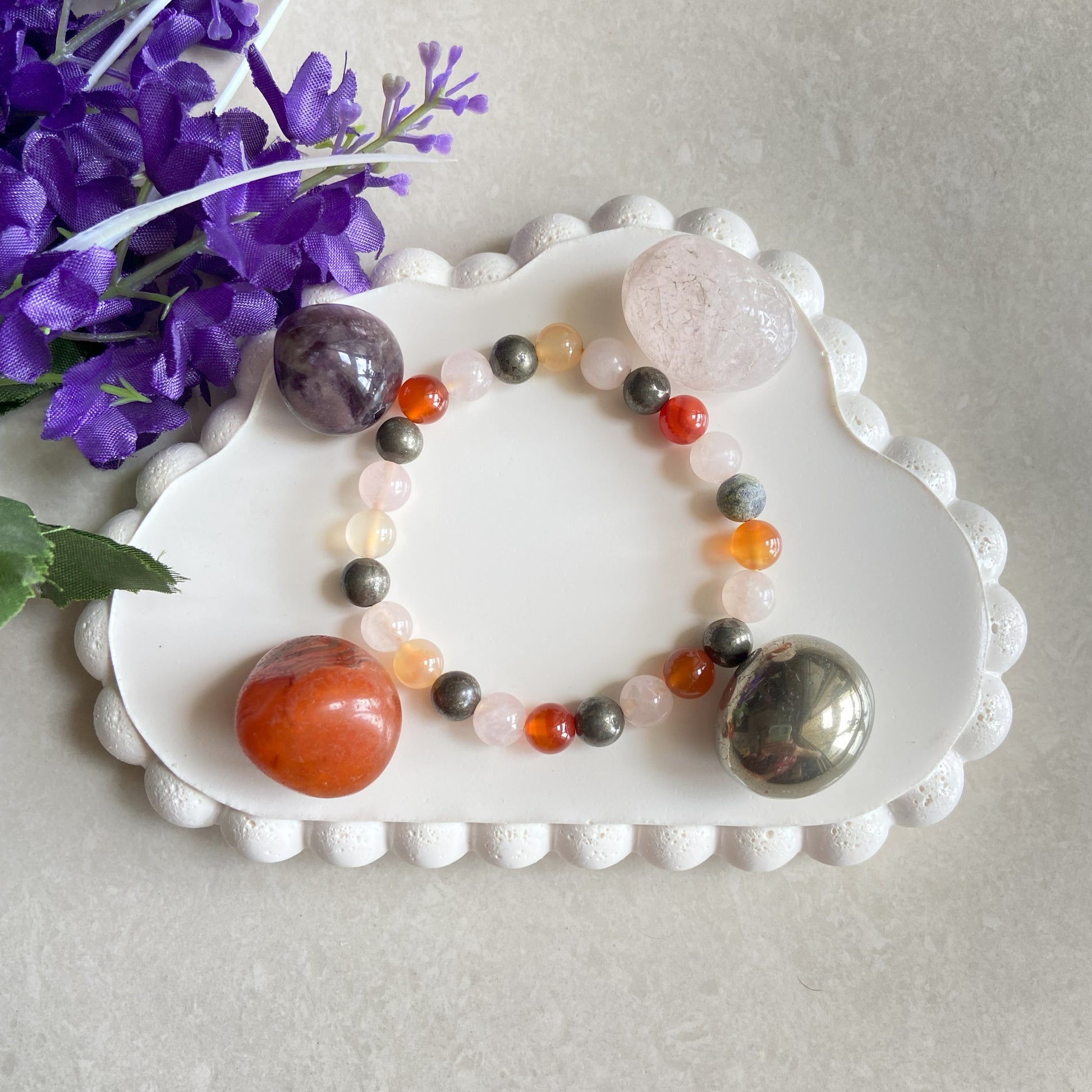 • Artisan-crafted using 8mm natural Carnelian, Rose Quartz, and Pyrite beads