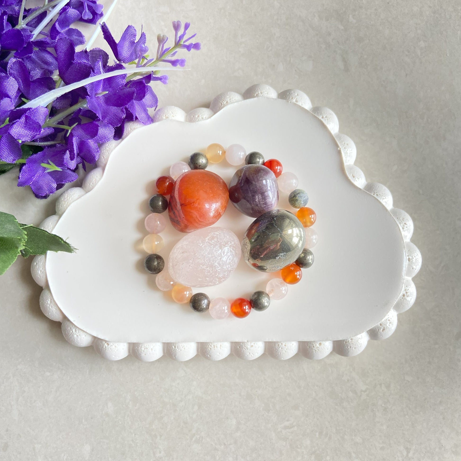 Embrace your sensual strength and unwavering serenity with the Earthspire Bracelet, a luxurious blend of Carnelian, Rose Quartz, and Pyrite — curated to nourish Taurus’ grounded nature, romantic heart, and quiet determination.